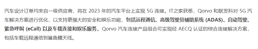 汽車設計訂單均來自一級供應商,將在 2023 年的汽車平臺上實現 5G 連接。IT之家獲悉,Qorvo 和聯發科對 5G 汽車解決方案進行優化,以支持更強大的安全和娛樂功能,包括遠程通信、高級駕駛員輔助系統 (ADAS)、自動駕駛、緊急呼叫 (eCall) 以及車載連接和娛樂服務。Qorvo 汽車連接產品組合可實現經 AECQ 認證的綜合連接解決方案,包括車載遠程通信到鯊魚鰭天線。