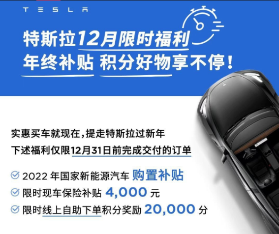 12 月 2 日消息:特斯拉方面今日宣布,國家新能源汽車購置補貼政策將于 12 月 31 日正式終止,為讓更多消費者趕上“國補”的末班車,特斯拉推出多種優惠政策。