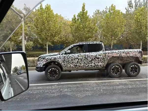 近日,網絡上曝光了一組長城上海炮皮卡的諜照,而其特殊之處在于,使用了6x6.也就是6輪驅動。