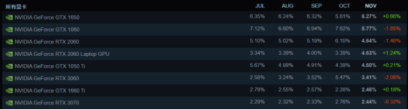 原標題:Steam 11 月硬件和軟件調查結果出爐:GTX 1650 份額超越 1060.RTX 3060 實際占有率最高