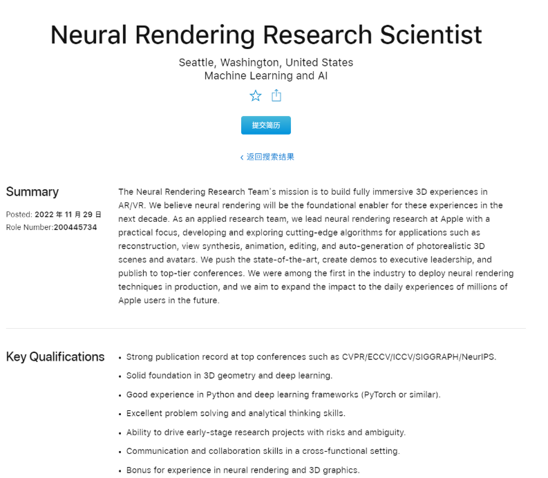 蘋果對于這一職位的要求非常高,至少要在 CVPR/ECCV/ICCV/SIGGRAPH/NeurIPS 等頂級會議發表過論文,具備計算機視覺、計算機圖形學、機器學習或相關領域的博士學位,而且熟練掌握 Python 和深度學習框架(PyTorch 或類似框架)等。