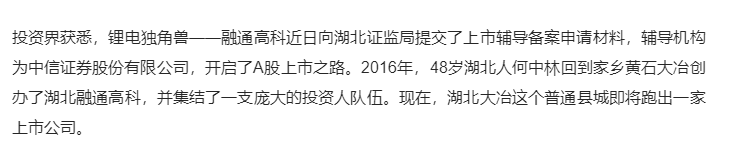 投資界獲悉,鋰電獨(dú)角獸——融通高科近日向湖北證監(jiān)局提交了上市輔導(dǎo)備案申請(qǐng)材料,輔導(dǎo)機(jī)構(gòu)為中信證券股份有限公司,開(kāi)啟了A股上市之路。2016年,48歲湖北人何中林回到家鄉(xiāng)黃石大冶創(chuàng)辦了湖北融通高科,并集結(jié)了一支龐大的投資人隊(duì)伍。現(xiàn)在,湖北大冶這個(gè)普通縣城即將跑出一家上市公司。