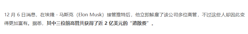 12 月 6 日消息:在埃隆?馬斯克(Elon Musk)接管推特后,他立即解雇了該公司多位高管,不過(guò)這些人卻因此變得更加富有。據(jù)悉,其中三位前高管共獲得了近 2 億美元的“遣散費(fèi)”。