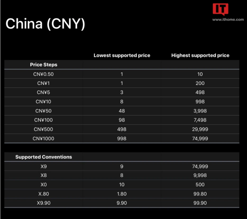 開發者在定價上末尾支持四種格式,包括“x.99”、“x.00”、“x.90”和“x.95”四種,但是四者支持的最高價格均有差別,具體可以看下圖。