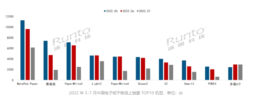 2022 年 5-7 月中國電子紙平板線上銷量 TOP10 機型,單位:臺