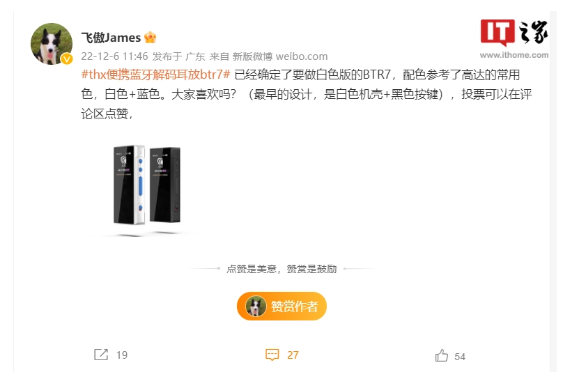 12 月 7 日消息:據(jù)飛傲聯(lián)合創(chuàng)始人飛傲 James 宣布,BTR7 便攜藍(lán)牙解碼耳放將推出白色版。配色參考了高達(dá)的常用色,白色 + 藍(lán)色。此前最早設(shè)計(jì)是白色機(jī)殼 + 黑色按鍵。