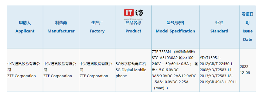 12 月 7 日消息:型號為 ZTE 7533N 的中興 5G 新機今日通過了 3C 認證,配備 22.5W 充電器。