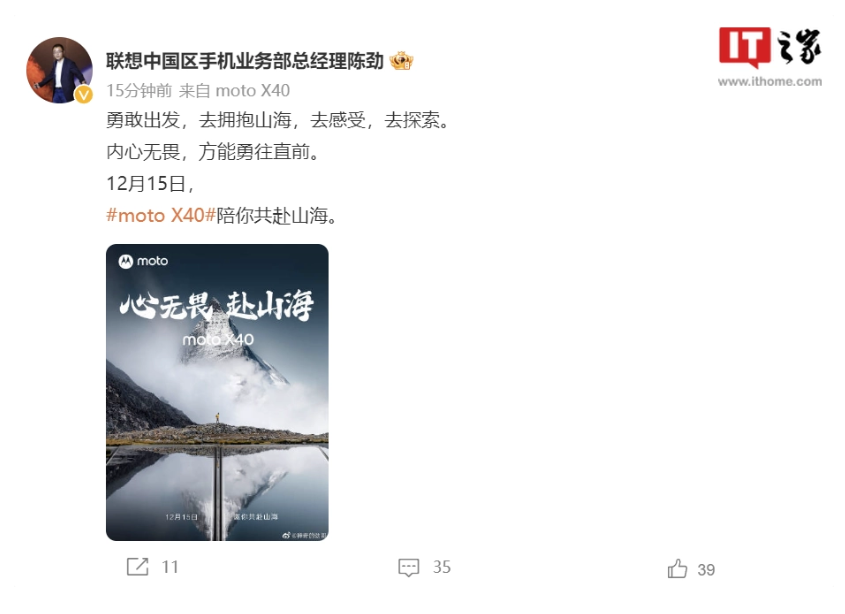 12 月 8 日消息:聯想中國區手機業務部總經理陳勁今日通過社交媒體表示,摩托羅拉 moto X40 將于 12 月 15 日發布。