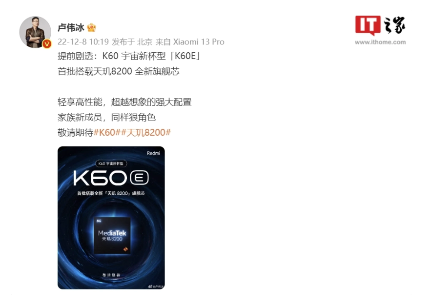 12 月 8 日消息:小米集團合伙人、中國區、國際部總裁,Redmi 品牌總經理盧偉冰今日上午透過社交媒體帶來了提前劇透,稱 K60 宇宙新杯型“K60E”首批搭載天璣 8200 全新旗艦芯。