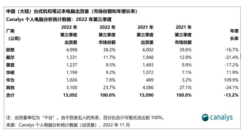 原標(biāo)題: Canalys:中國(guó)個(gè)人電腦 2022 年第三季度出貨量下降 13%