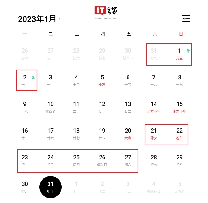 12 月 9 日消息:中國政府網今日發布了國務院辦公廳關于 2023 年部分節假日安排的通知。2023 年元旦、春節、清明節、勞動節、端午節、中秋節和國慶節放假調休日期的具體安排如下: