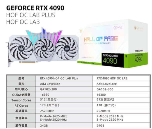 12 月 10 日消息:影馳(GALAX)今天推出了兩款名人堂 GPU 系列顯卡--OC Lab 和 OC Lab Plus。兩款顯卡均采用 Ada Lovelace 架構,GA102-300 架構,擁有 16380 個 CUDA 處理器核心,基礎時鐘頻率為 2520MHz,24GB 的 GDDR6X 顯存,384-bit 的顯存頻率。