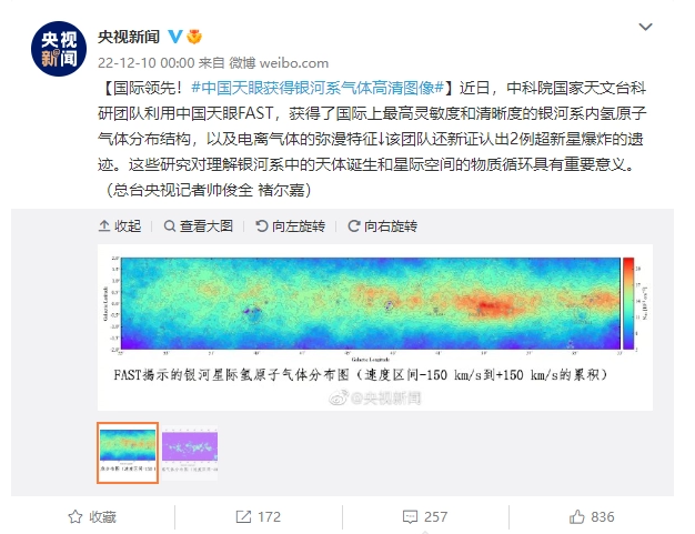 12 月 10 日消息:據央視報道,中科院國家天文臺科研團隊利用中國天眼 FAST,獲得了國際上最高靈敏度和清晰度的銀河系內氫原子氣體分布結構,以及電離氣體的彌漫特征,而且該團隊還新證認出 2 例超新星爆炸的遺跡。