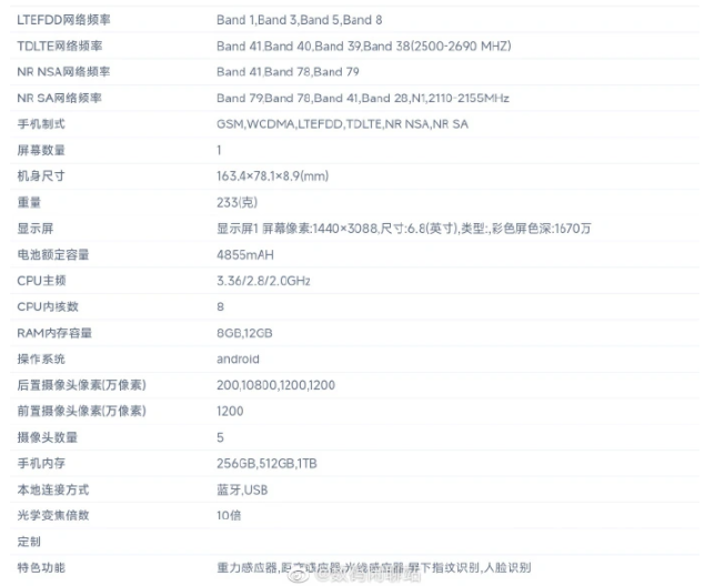 據(jù)悉,三星將首發(fā)獨(dú)占 3.36GHz 高頻版驍龍 8 Gen2.采用 6.8 英寸 3088*1440p 分辨率 OLED 顯示屏,前置 12Mp 自拍攝像頭,后置四攝,分別是一個(gè) 200 萬像素傳感器(根據(jù)傳聞應(yīng)該是 2 億像素)、一個(gè) 108Mp 傳感器,12Mp+12Mp 雙長焦支持 10X 光變。此外,該機(jī)提供 8GB、12GB 內(nèi)存,256GB、512GB、1TB 存儲(chǔ),內(nèi)置 5000mAh 電池,附帶 25W 充電頭,機(jī)身尺寸為 163.4×78.1×8.9mm,重 233g。