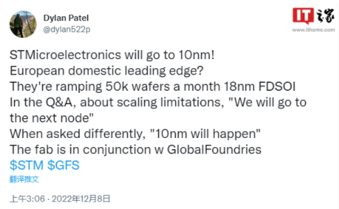 12 月 11 日消息:半導(dǎo)體分析師 Dylan Patel 稱(chēng)意法半導(dǎo)體未來(lái)將進(jìn)軍 10nm 工藝,不過(guò)考慮到提到的晶圓廠直到 2026 年才能滿(mǎn)負(fù)荷生產(chǎn) 18nm 工藝,實(shí)現(xiàn) 10nm 工藝的具體時(shí)間可能較晚。