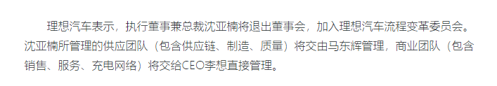 理想汽車表示,執行董事兼總裁沈亞楠將退出董事會,加入理想汽車流程變革委員會。沈亞楠所管理的供應團隊(包含供應鏈、制造、質量)將交由馬東輝管理,商業團隊(包含銷售、服務、充電網絡)將交給CEO李想直接管理。