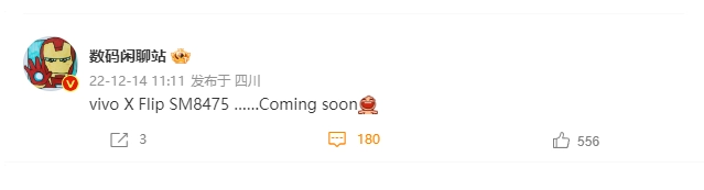 12 月 14 日消息:數碼博主 @數碼閑聊站 今日透露,vivo 的豎向翻蓋式折疊屏手機 vivo X Flip 將很快到來,搭載高通驍龍 8+ Gen1 平臺。