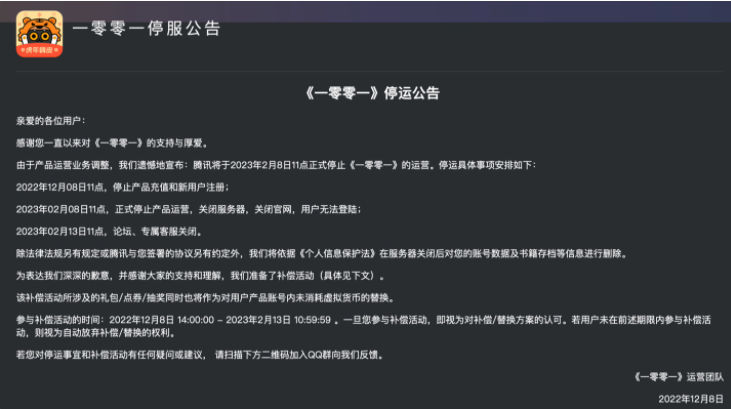 12 月 15 日消息:騰訊互動閱讀 App《一零零一》現已宣布將在 2023 年 2 月 8 日停運。