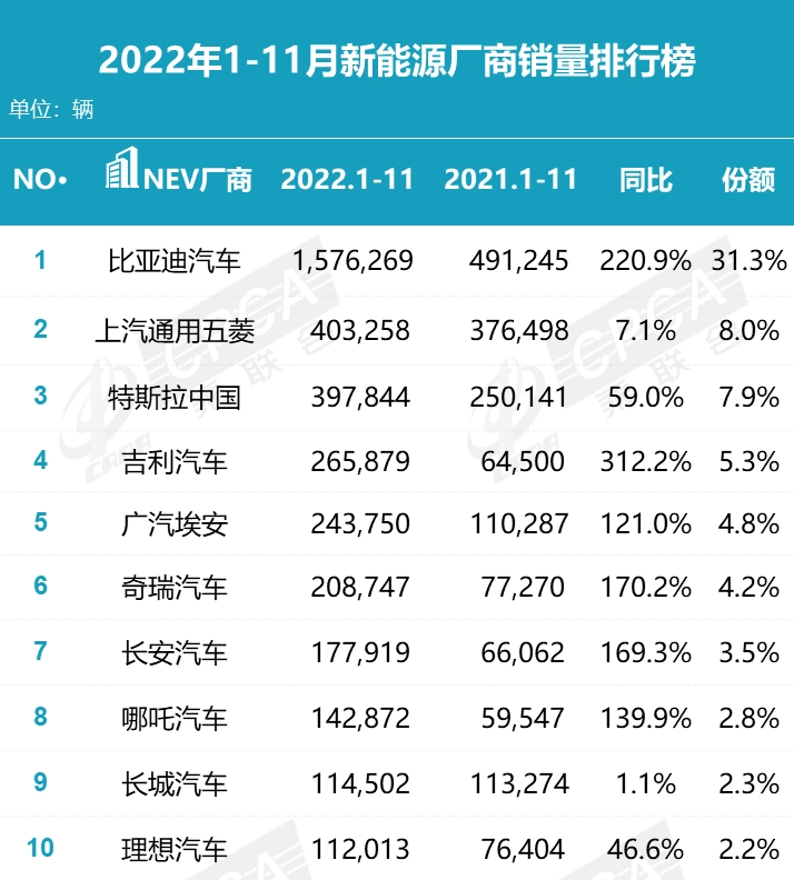 IT之家了解到,乘聯會數據顯示,今年 1~11 月,比亞迪汽車、上汽通用五菱、特斯拉中國依然是新能源銷量前三名的廠商,后續分別為吉利汽車、廣汽埃安、奇瑞汽車、長安汽車、哪吒汽車、長城汽車、理想汽車、小鵬汽車、蔚來汽車、零跑汽車、一汽大眾、上汽大眾。