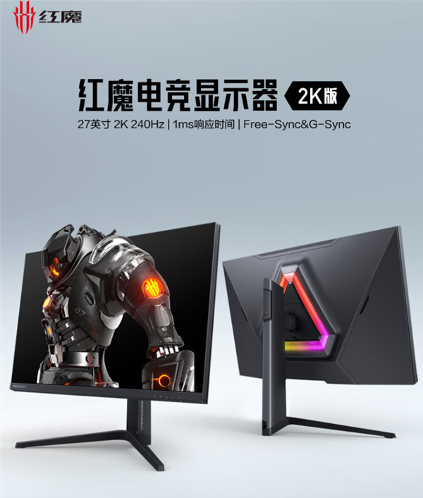 紅魔27英寸電競顯示器2K版規(guī)格采用側(cè)入式背光、無分區(qū),分辨率為2560*1440,支持240Hz高刷(其他兩款均為160Hz),兼容Free-Sync和G-Sync。