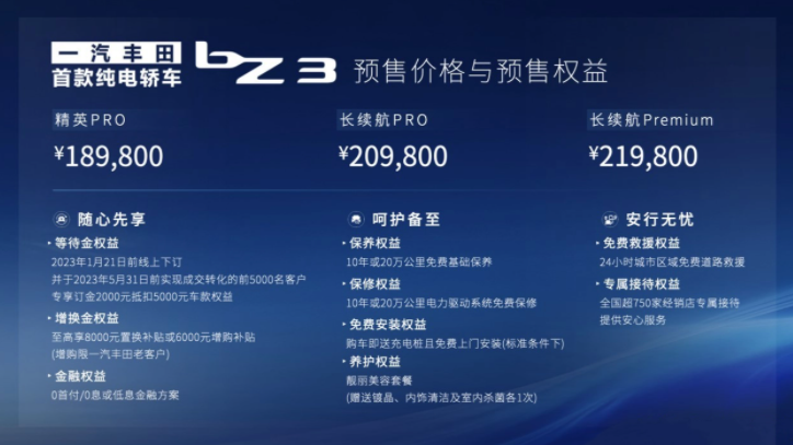 12 月 19 日消息:在昨晚的一汽豐田 1000 萬用戶達成盛典上,一汽宣布豐田 bZ3 開啟預售,預售 18.98-21.98 萬。此外,官方還將提供隨心先享三大權益、呵護備至四大權益、安行無憂兩大權益。