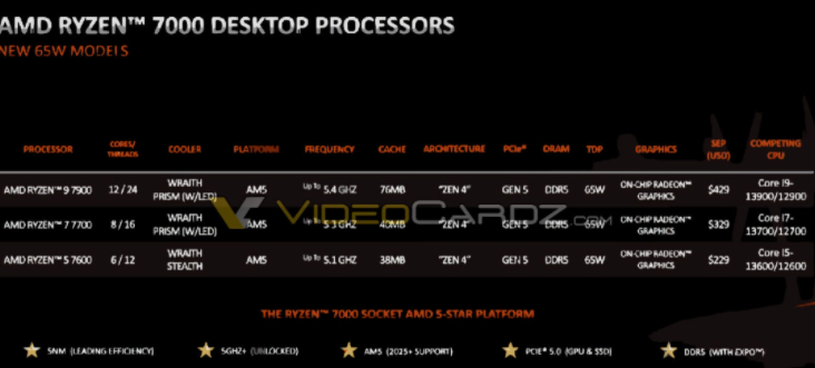 從圖中可以看到,PPT 顯示 AMD 銳龍 7000 系列的 R9 7900、R7 7700、R5 7600 都是 65W TDP,具體規格為: