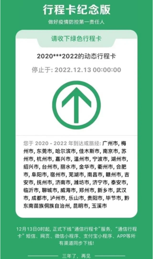 12月13日通信行程卡下線之前相信很多朋友都已經(jīng)提前截了圖,以留下我們疫情這三年的紀(jì)念。最近一款新型服務(wù)“行程卡紀(jì)念版”在朋友圈傳瘋,能3秒生成行程卡紀(jì)念版,內(nèi)容可手動(dòng)選擇這3年到過(guò)的地區(qū),并生成一張類(lèi)似通信行程卡的3年行程截圖,目前該小程序服務(wù)功能違規(guī)被暫停服務(wù)。有網(wǎng)友覺(jué)得這個(gè)可虛假選擇地區(qū)也沒(méi)多大意義,還有網(wǎng)友擔(dān)心四大運(yùn)營(yíng)商和中國(guó)信通院是否真的刪除我們的隱私記錄。