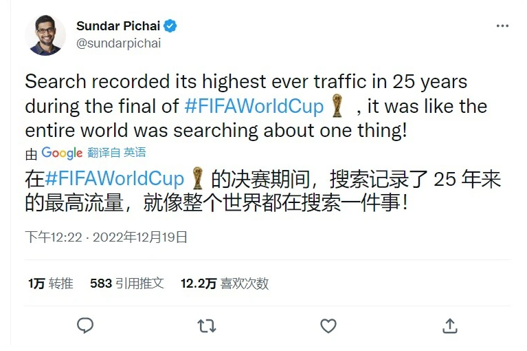12 月 20 日消息:昨天對于 Google Search 來說是非常有歷史意義的一天:FIFA 卡塔爾世界杯決賽期間刷新了谷歌成立 25 年以來的最高流量紀錄。谷歌首席執行官桑達爾?皮查伊(Sundar Pichai)在最新推文中宣布流量打破公司成立 25 年以來紀錄。