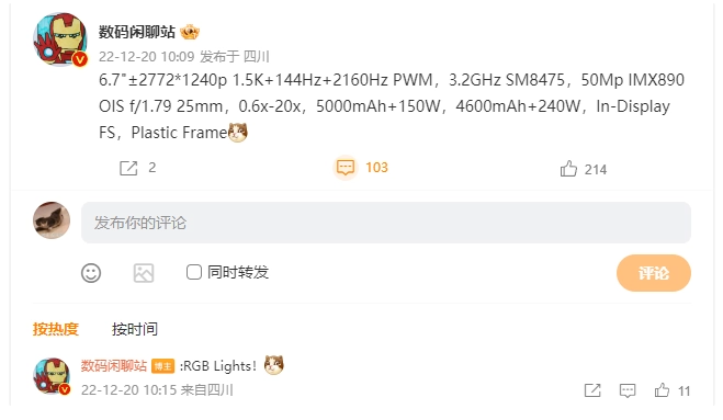 據(jù)介紹,該機(jī)將采用 6.7 英寸的 1.5K 大屏。分辨率為 2772*1240p,支持 144Hz 刷新率以及 2160Hz PWM 調(diào)光,搭載 3.2GHz 的第一代高通驍龍 8 + 芯片,分別采用 5000mAh 電池 + 150W 快充以及 4600mAh 電池 + 240W 快充。