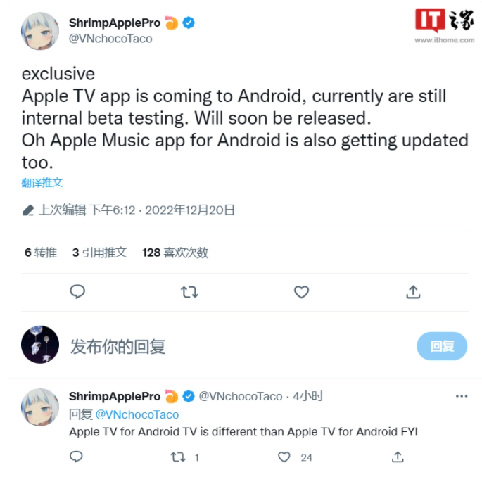 12 月 21 日消息:據(jù)爆料人 ShrimpApplePro 的消息,蘋果計劃將其 Apple TV 應(yīng)用帶到安卓平臺,該用戶此前準(zhǔn)確爆料了 iPhone 14 Pro 的靈動島設(shè)計和包裝盒。