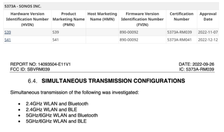 12 月 21 日消息:據(jù) Zatz Not Funny! 的發(fā)現(xiàn),Sonos 在美國和加拿大分別注冊入網(wǎng)了代號為 S39 和 S41 的兩款新品,文件中提到會有低耗藍(lán)牙、Wi-Fi 6、升級無線規(guī)格等。