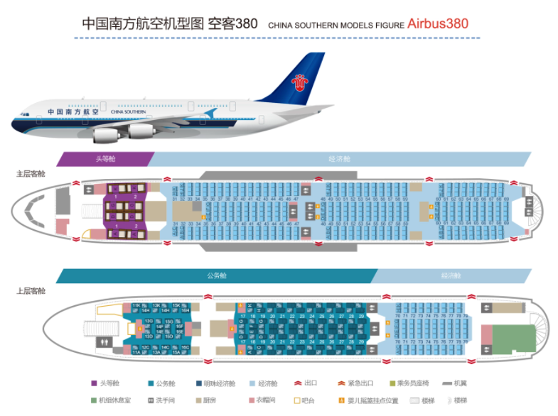 據南航官網介紹,中國南方航空是中國唯一一家運營 A380 超大客機的航空公司。A380 是迄今世界上最大的寬體客機,擁有雙層客艙,與現有最大機型相比,載客量多出 40% 。A380 長 72.73 米,翼展 79.15 米,高 24.07 米,起飛重量可達 560 噸,飛行距離可達 15000 公里,是名副其實的空中巨無霸。