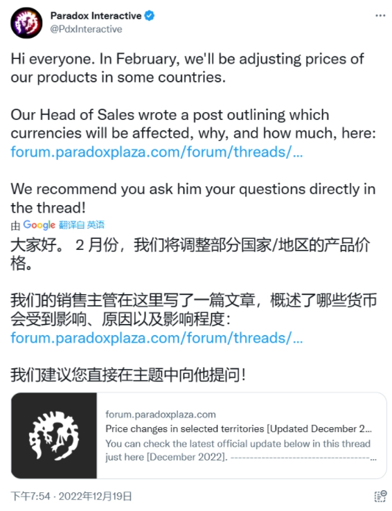 P 社的銷售主管 Mattias Rengsted 近日發文宣布,自 2023 年 2 月 1 日起,將在部分地區調整旗下游戲和 DLC 的價格。