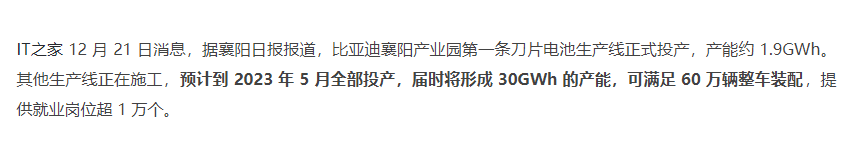 12 月 21 日消息:據襄陽日報報道,比亞迪襄陽產業園第一條刀片電池生產線正式投產,產能約 1.9GWh。其他生產線正在施工,預計到 2023 年 5 月全部投產,屆時將形成 30GWh 的產能,可滿足 60 萬輛整車裝配,提供就業崗位超 1 萬個。