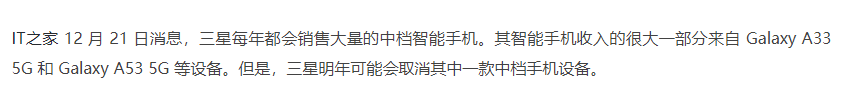 12 月 22 日消息:三星每年都會銷售大量的中檔智能手機。其智能手機收入的很大一部分來自 Galaxy A33 5G 和 Galaxy A53 5G 等設備。但是,三星明年可能會取消其中一款中檔手機設備。