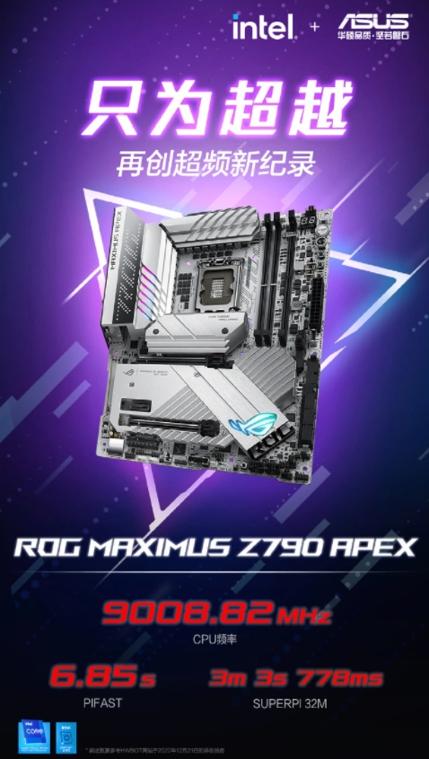 12 月 22 日消息:據 ROG 官方消息,ROG MAXIMUS Z790 APEX 主板再創新紀錄 ——CPU 頻率 9008.82MHz。ROG 表示將不斷向超 10G 前進。
