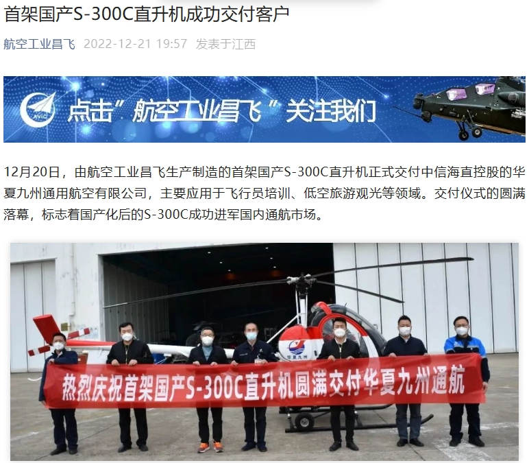 12 月 22 日消息:據航空工業昌飛消息,12 月 20 日,由航空工業昌飛生產制造的首架國產 S-300C 直升機正式交付中信海直控股的華夏九州通用航空有限公司,主要應用于飛行員培訓、低空旅游觀光等領域,標志著國產化后的 S-300C 成功進軍國內通航市場。