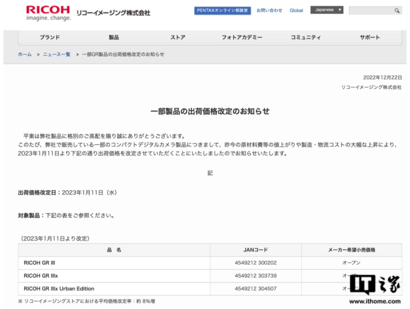 12 月 22 日消息:據理光官網消息,由于近期原材料成本上漲以及制造和物流成本增加,自 2023 年 1 月 11 日起,官方對部分緊湊型數碼相機產品的價格進行了調整,漲價幅度約 8%。