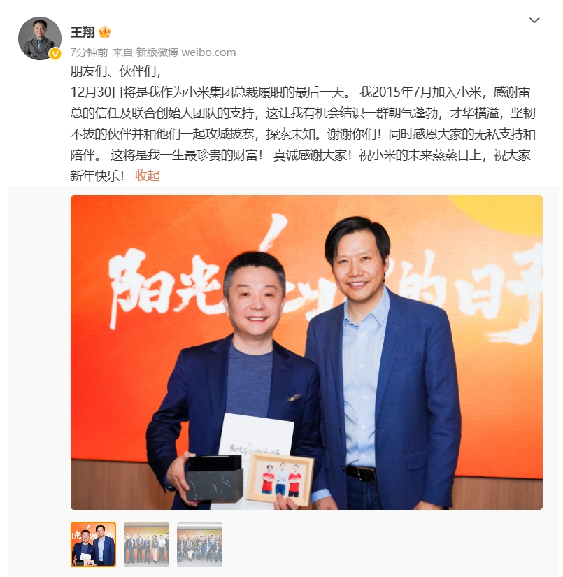 12 月 23 日消息:小米集團合伙人、總裁王翔昨日晚間宣布,12 月 30 日將是他作為小米集團總裁履職的最后一天,并曬出了與雷軍等小米高管的合影。
