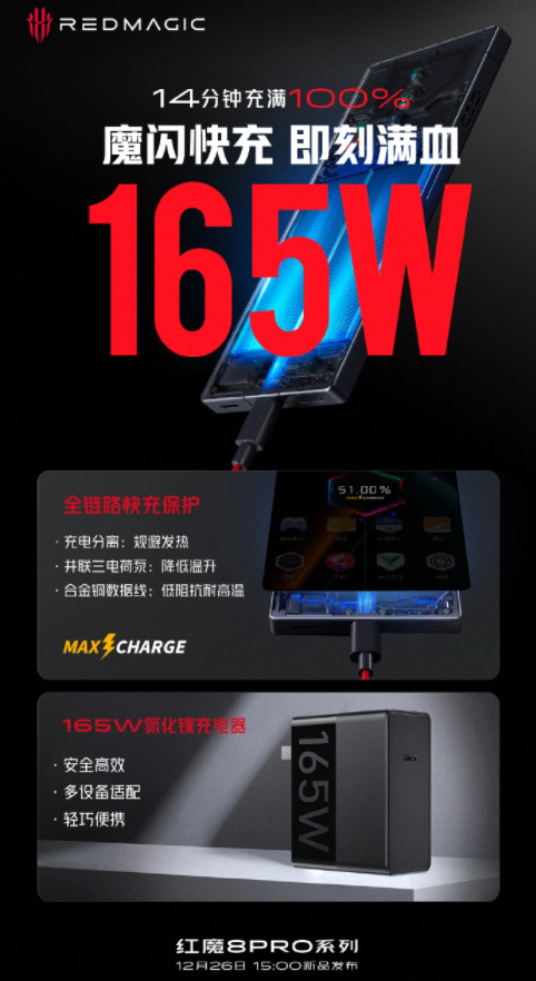 12 月 23 日消息:紅魔游戲手機將于 12 月 26 日 15:00 發布,紅魔官方今日上午帶來了紅魔 8 Pro 系列的最新預熱信息,公布了新機的快充配置。