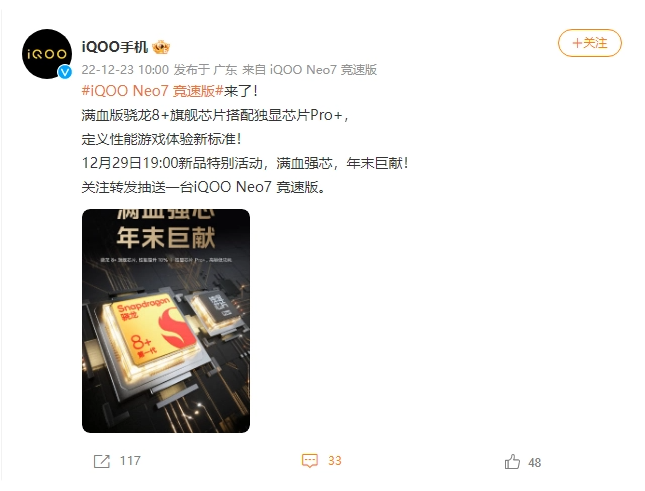 現(xiàn)在,iQOO Neo7 競速版官宣將于 12 月 29 日 19:00 發(fā)布,搭載滿血版高通驍龍 8+ 芯片,搭配獨顯芯片 Pro+。