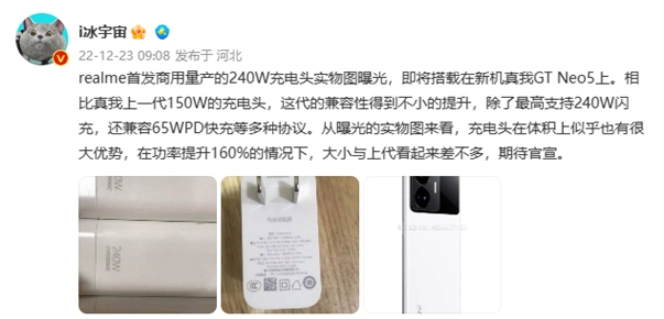 原標(biāo)題:realme 真我 GT Neo5 充電頭曝光:支持 240W 充電