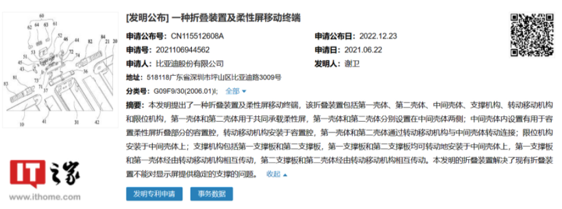 12 月 23 日消息:據(jù)國(guó)家知識(shí)產(chǎn)權(quán)局中國(guó)專利公布公告(申請(qǐng)公布號(hào):CN115512608A)顯示比亞迪股份有限公司申請(qǐng)的“一種折疊裝置及柔性屏移動(dòng)終端”專利獲授權(quán)公布。