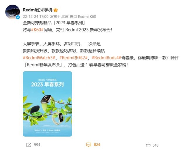 Redmi今日表示,全新可穿戴新品“2023早春系列”將與K60系列一同發布,其中包括Redmi Watch 3手表、Redmi手環2以及RedmiBuds 4青春版。