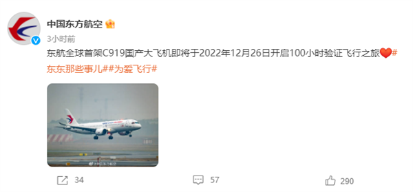 12月24日,據(jù)“中國東方航空”官方消息,東航全球首架C919國產(chǎn)大飛機即將于2022年12月26日開啟100小時驗證飛行之旅。