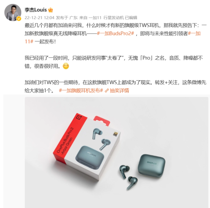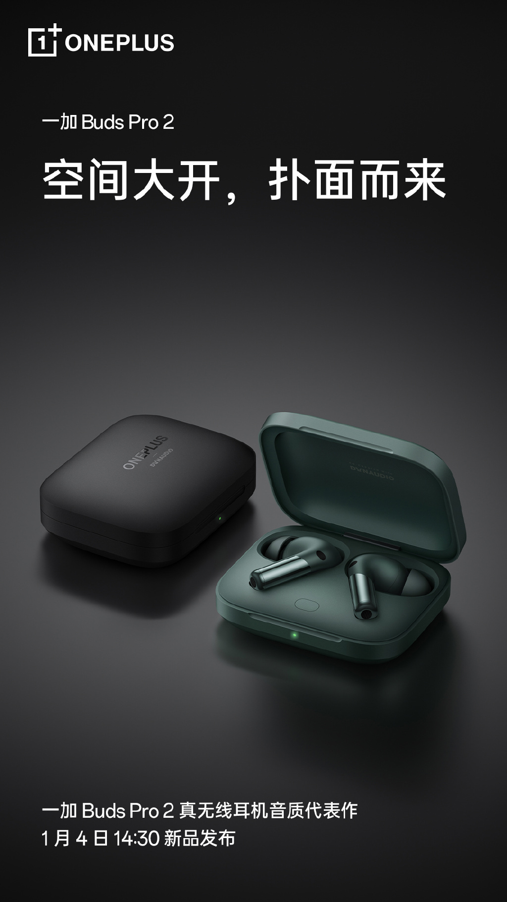 一加 Buds Pro 2 現宣布將于 1 月 4 日與一加 11 一同發布,號稱“真無線耳機音質代表作”,支持空間音頻。