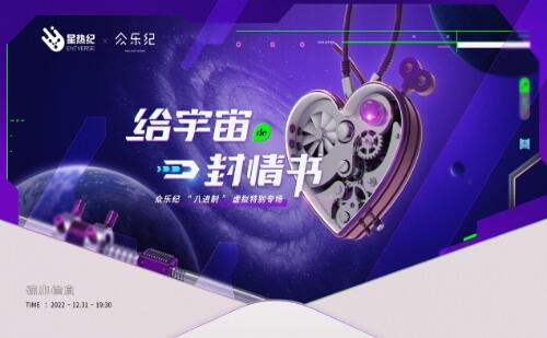 每一種媒介,都催生一個世界。互聯網之后,信息解構時空,我們穿梭于遠近與虛實之中。而“元宇宙”時代,一片孕育未知潛力、擁有無限可能的廣闊空間也正悄然開啟。2022年12月31日19:30星熱紀ENTVERSE聯合民謠音樂廠牌眾樂紀帶來「給宇宙的一封情書」跨年特別專場,融合元宇宙的未來感與空靈于民謠的質樸與溫柔,搭配APP內全新登陸的社交娛樂功能板塊,塑造充滿科技感的虛擬演出體驗,邁出探索「元宇宙生活方式」的關鍵一步。