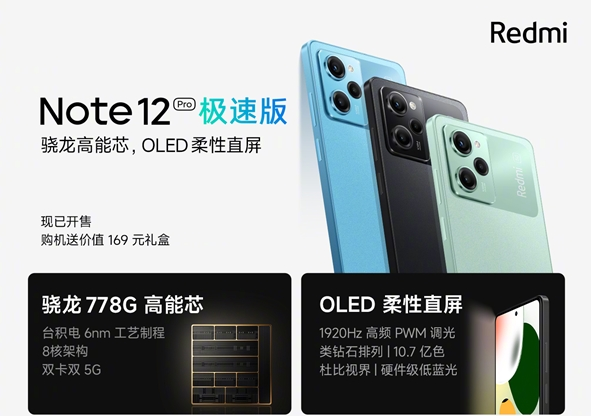相比于已有的Redmi Note 12 Pro,這款極速版將處理器從聯發科天璣1080更換為經久不衰的高通驍龍778G,臺積電6nm工藝,雙核A76加和A55 CPU,Adreno 620 GPU,綜合性能可以提升近20%。