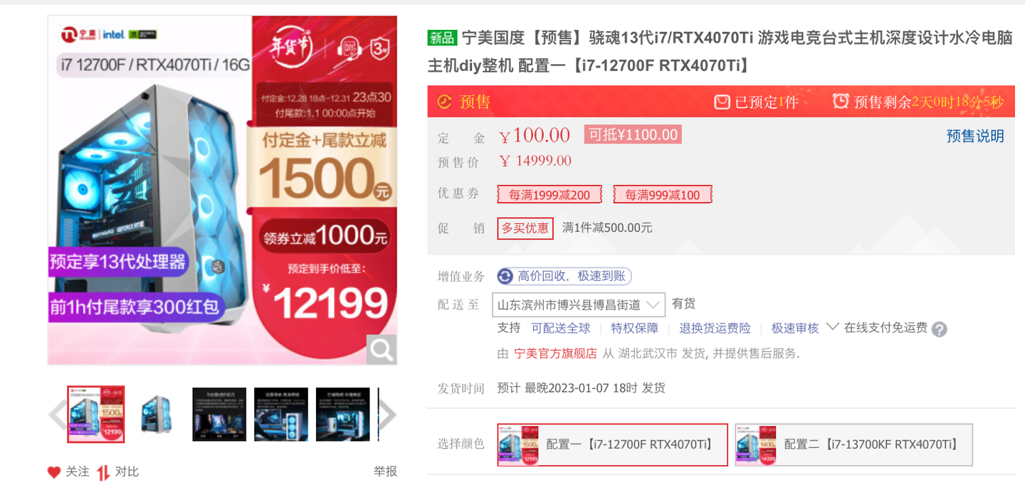 如上圖所示,搭載 RTX 4070 Ti 顯卡的臺(tái)式機(jī)的售價(jià)低至 12199 元,高端型號(hào)售價(jià)超 14000 元。此外,京東頁面顯示,RTX 4070 Ti 整機(jī)將在 1 月 7 日起發(fā)貨。