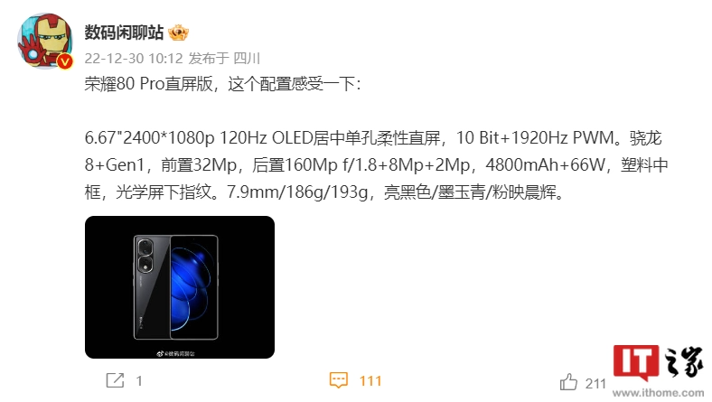 原標(biāo)題:榮耀 80 Pro 直屏版配置全曝光,搭載驍龍 8+、120Hz OLED 直屏